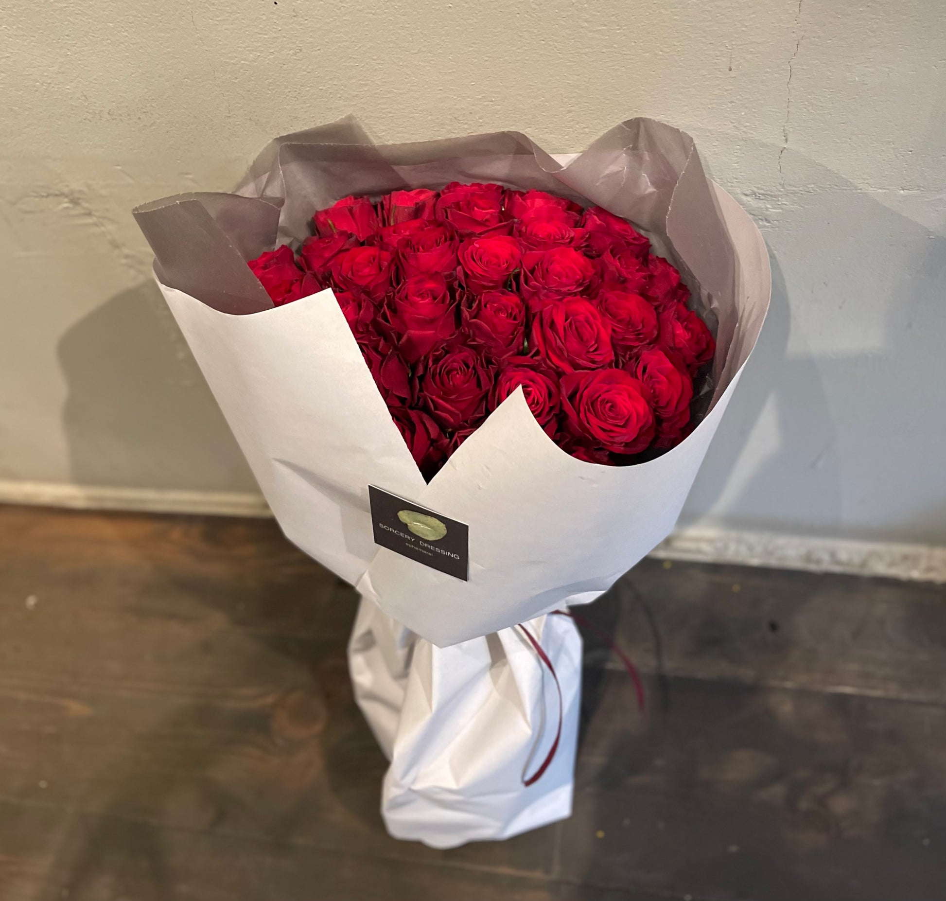 プロポーズやお誕生日など特別な日に贈る、赤いバラだけの花束です。